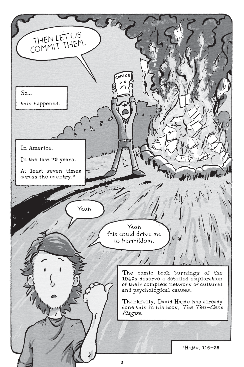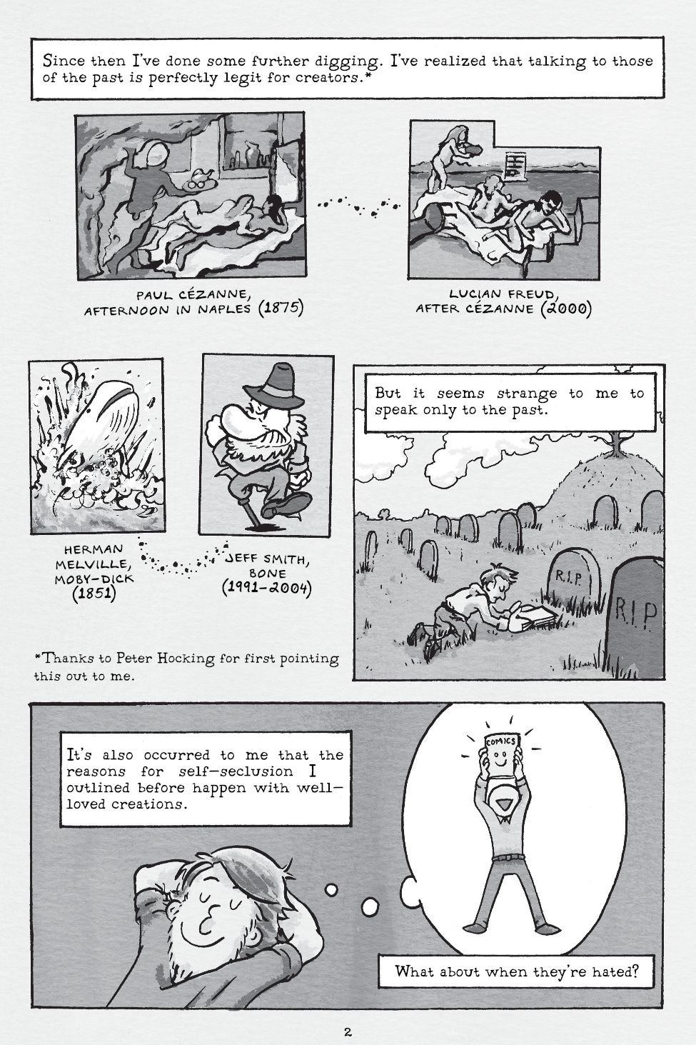An essay comic from Tyson ca. 2015 as he tries to figure out his relationship to "the greater culture" as an aspiring comics artist. Includes reflections on reclusive cartoonists, book burnings, and fine art.